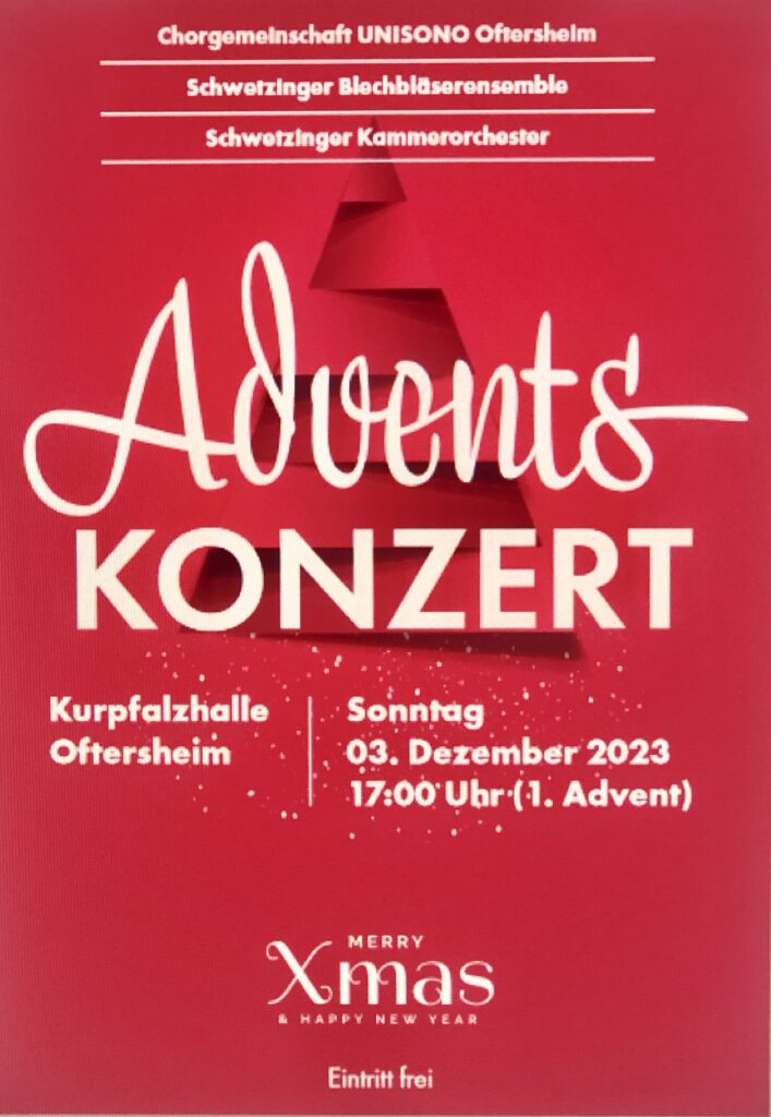 Am 03. Dezember 2023 ( 1. Advent ) führten wir zusammen mit dem Chor „UNISONO“ und dem Blechbläser-Ensemble Schwetzingen in Oftersheim unser großes Adventskonzert auf. Die Kurpfalzhalle war bis auf den letzten Platz gefüllt, der Applaus wollte nicht enden !
